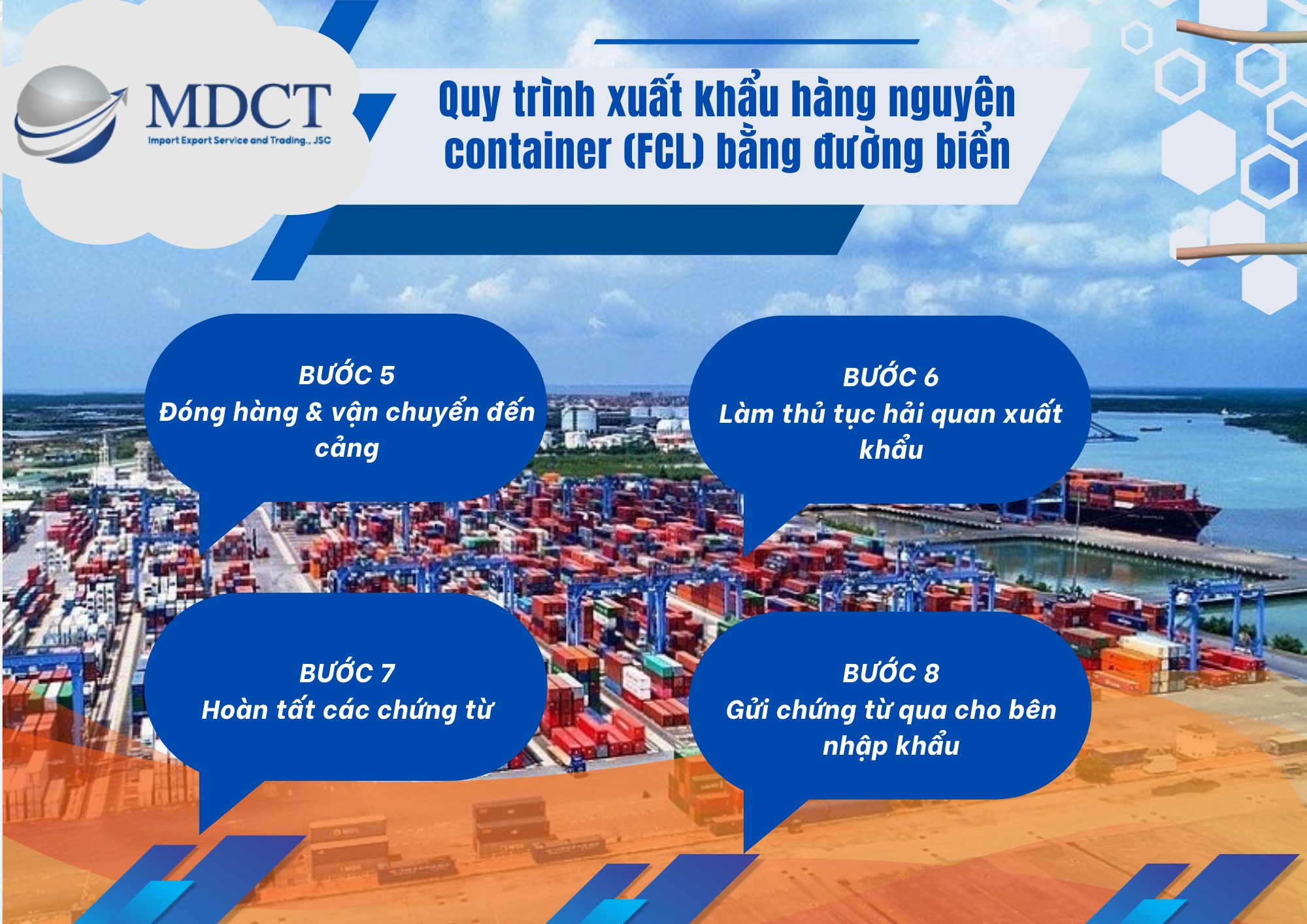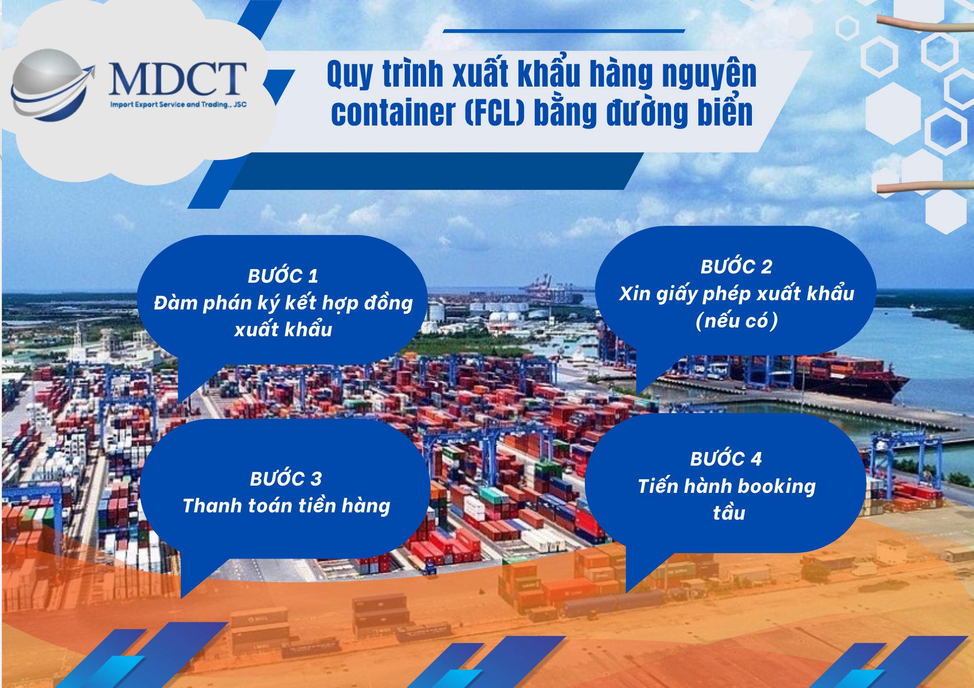 Quy trình xuất khẩu hàng hóa bao gồm nhiều bước và có quan hệ chặt chẽ với nhau. Do đó, để có thể làm việc trong ngành xuất nhập khẩu nói riêng và logistics nói chung. Bạn cần nắm thật rõ quy trình này. Hiểu được điều này, các chuyên gia của MDCT Logistics đã tổng hợp đầy đủ và chi tiết nhất về quy trình xuất khẩu hàng hóa nguyên container (FCL) bằng đường biển.